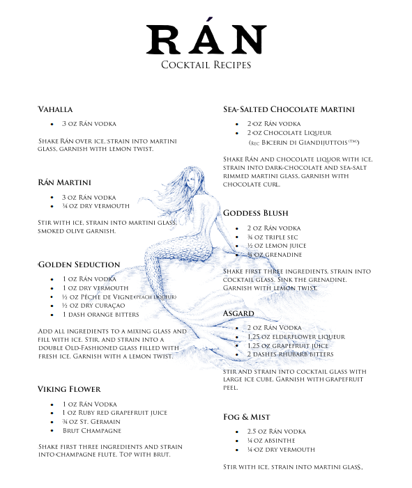 Rán is a wheat vodka infused with a touch of sea salt harvested from the pristine waters of the coast of San Juan Island. Beautiful, Impulsive, Insatiable, Rán was a force to reckon with. The presence of her spirit will enliven any cocktail.